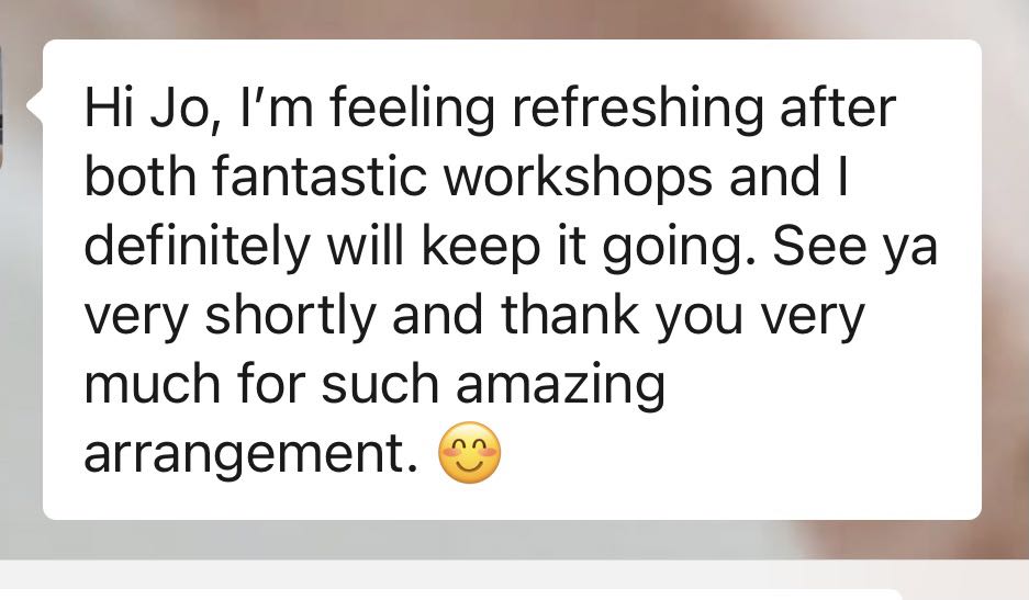 I’m looking back so fondly at the two day workshop we had. From start to end, it was so special to tap into the intuitive parts of myself and let creativity spring out from this inner connection and listening. I loved the physical ensemble work that allowed me to be individually expressive within a set structure, but also sync and complement others that made me feel very connected to others.On both an emotional and physical level.